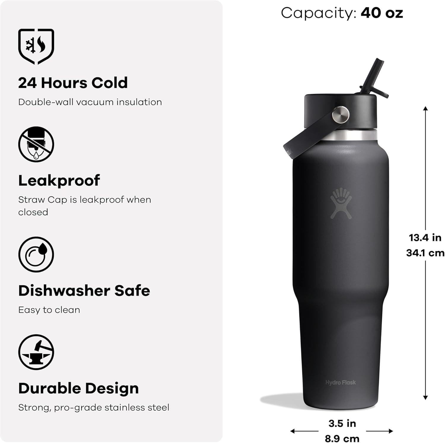 Hydro Flask Travel Water Bottle – Insulated Stainless Steel – Wide Straw Lid, Non Spill, Leakproof in 40 Oz Capri Blue(TONAL BLACK)