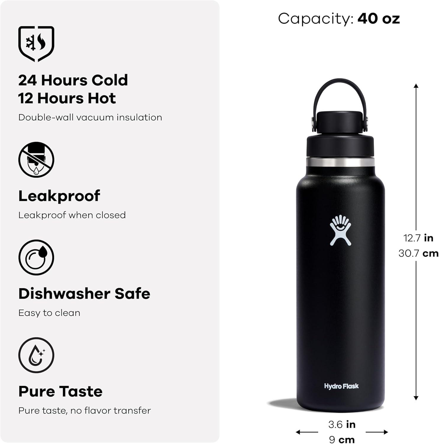 24 HOURS COLD: The insulated bottle keeps drinks cold for 24 hours thanks to double-wall vacuum insulation. Hydro Flask water bottles feature TempShield insulation, keeping contents chilled all day. Flex Chug Cap not intended for use with hot drinks.