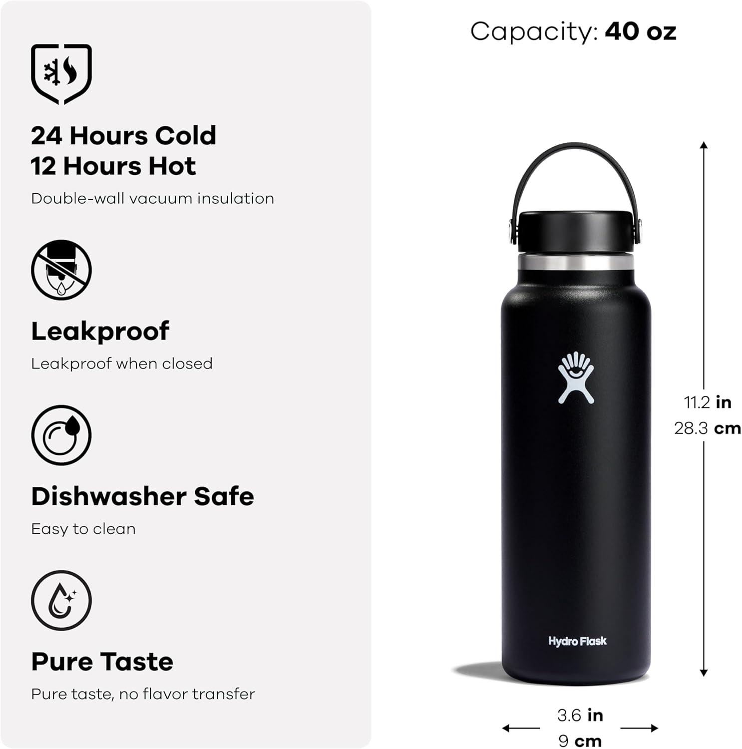 40 OZ POPSTAR PINK BOTTLE: Fill and refill with the Hydro Flask Wide Mouth insulated water bottle with leakproof cap. With a comfortable, flexible handle, the bottle is easy to grab and take anywhere. Double-wall insulation keeps drinks cold up to 24 hours and hot for 12 for ideal refreshment.
